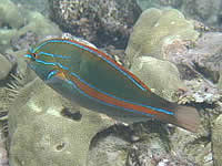 キヌベラ 水深が比較的浅く、波が強く打ち付けるような海域で時々見掛けます。成長したオスは左の写真のような色をしていますが、メス及び若いオスは緑と茶の細かい縦縞の模様です。 30p位まで成長します。食用として古代のハワイアンにとても人気がありました。 撮影ポイント:C |